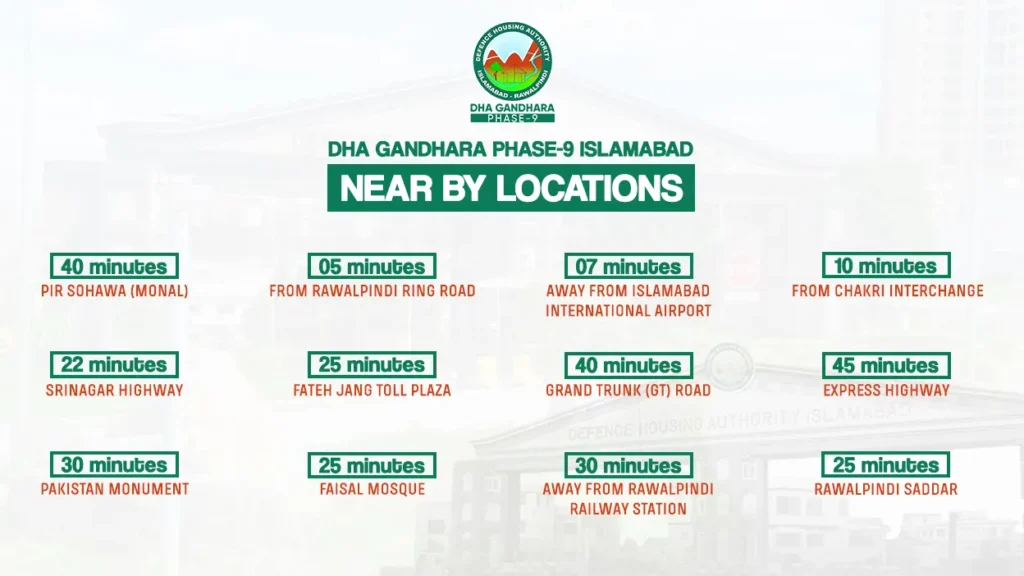 DHA Gandhara (Phase 9) is strategically located along the M-2 Lahore-Islamabad Motorway, offering seamless connectivity to both Islamabad and Rawalpindi. Situated adjacent to Capital Smart City Islamabad, it is in close proximity to several key landmarks, including the New Islamabad International Airport, Rawalpindi Ring Road (RRR), Chakri Interchange, and Thallian Interchange.This prime location ensures residents enjoy excellent connectivity to major transportation hubs and urban centers, making DHA Gandhara a highly desirable choice for those seeking convenience and a modern lifestyle.